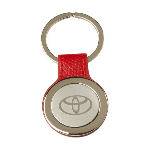 Simple yet elegant. Round polished chrome key ring has colorful leatherette strap sandwiched between polished chrome front and back. Large split ring for easy handling. Toyota Symbol on metal tag. Red